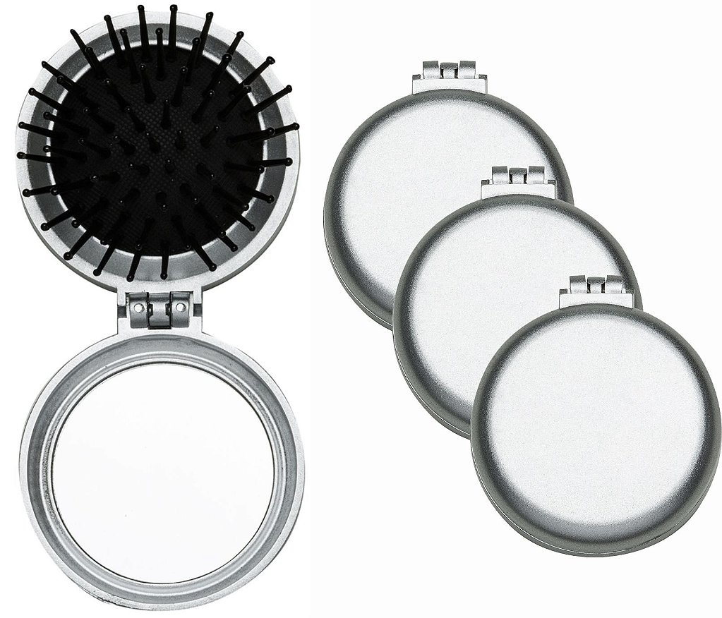 Escova com espelho redonda personalizada. Personalização colorida diretamente na peça. Medida 7,5 cm de comprimento e 6,6 cm de diâmetro.